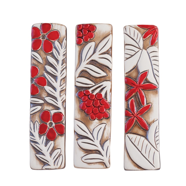 Design inspired by New Zealand blooms/berries from the Manuka, Puriri, and Clematis Indivisia (or Puawananga). The tiles have u-shaped hooks on the back to hang on interior or exterior walls.