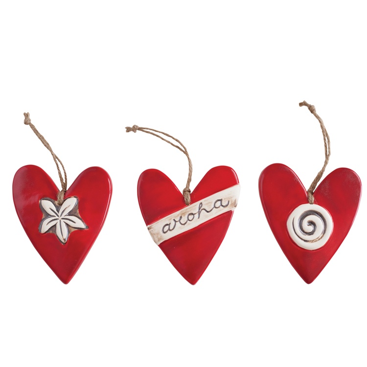Set of three ceramic hearts in natural/red glazes, designed to be hung on interior/exterior walls. The designs are inspired by the koru (unfurling fern frond), frangipani flower and aroha/love.