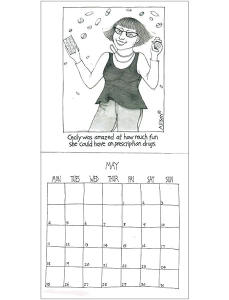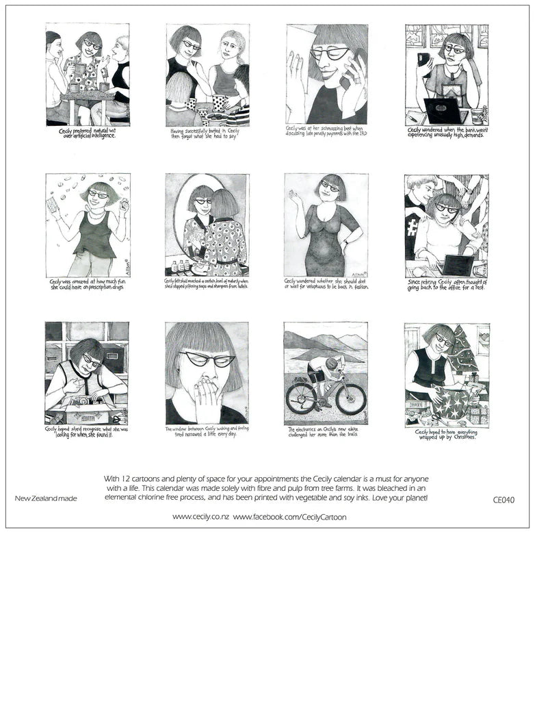 This years calendar is an eclectic mix of new and old cartoons. With a different cartoon for each month and plenty of space to write in your appointments and events the Cecily calendar is a necessity for anyone with a life. Made in New Zealand solely with fibre and pulp from farmed trees, bleached with an elemental chlorine free process then printed with plant based inks.