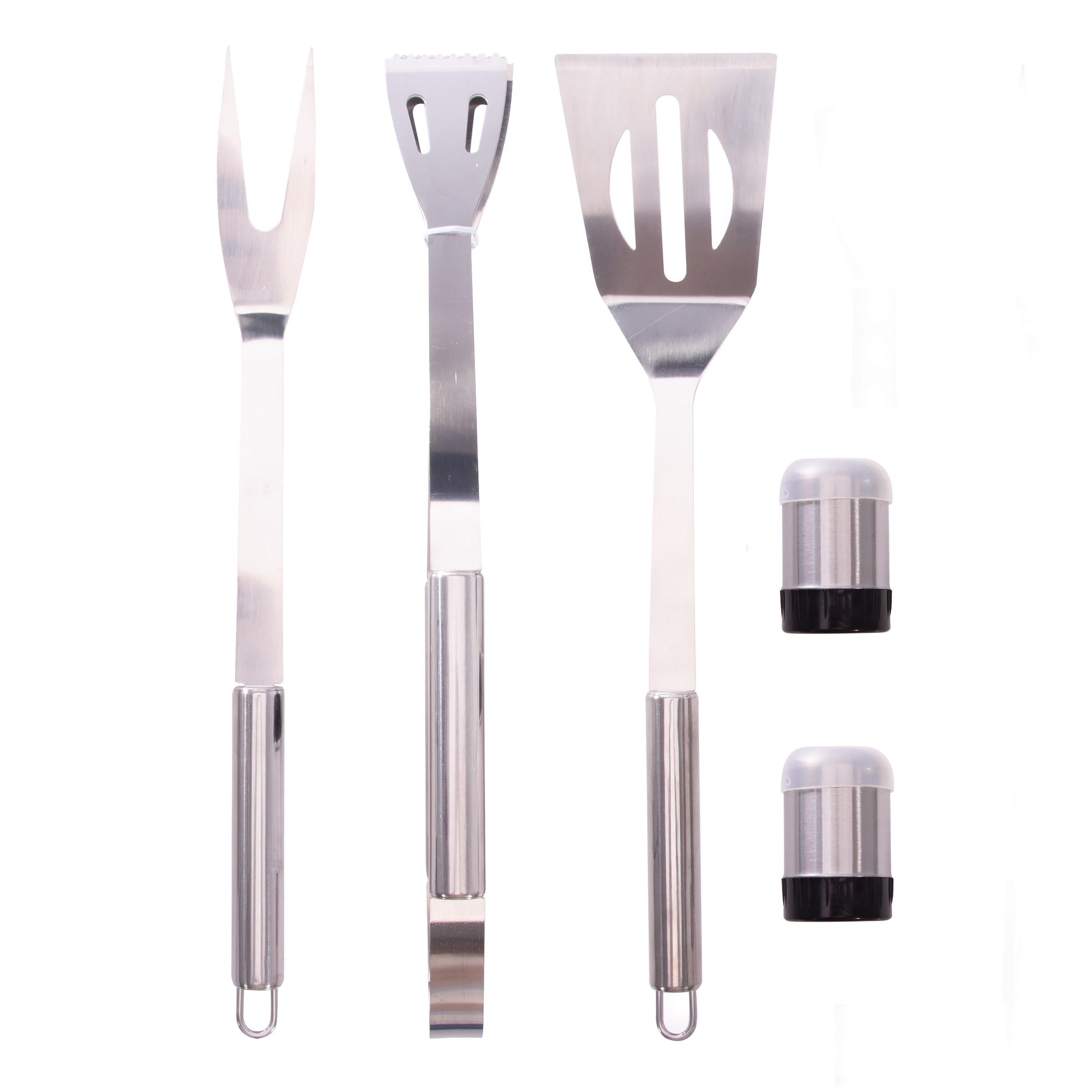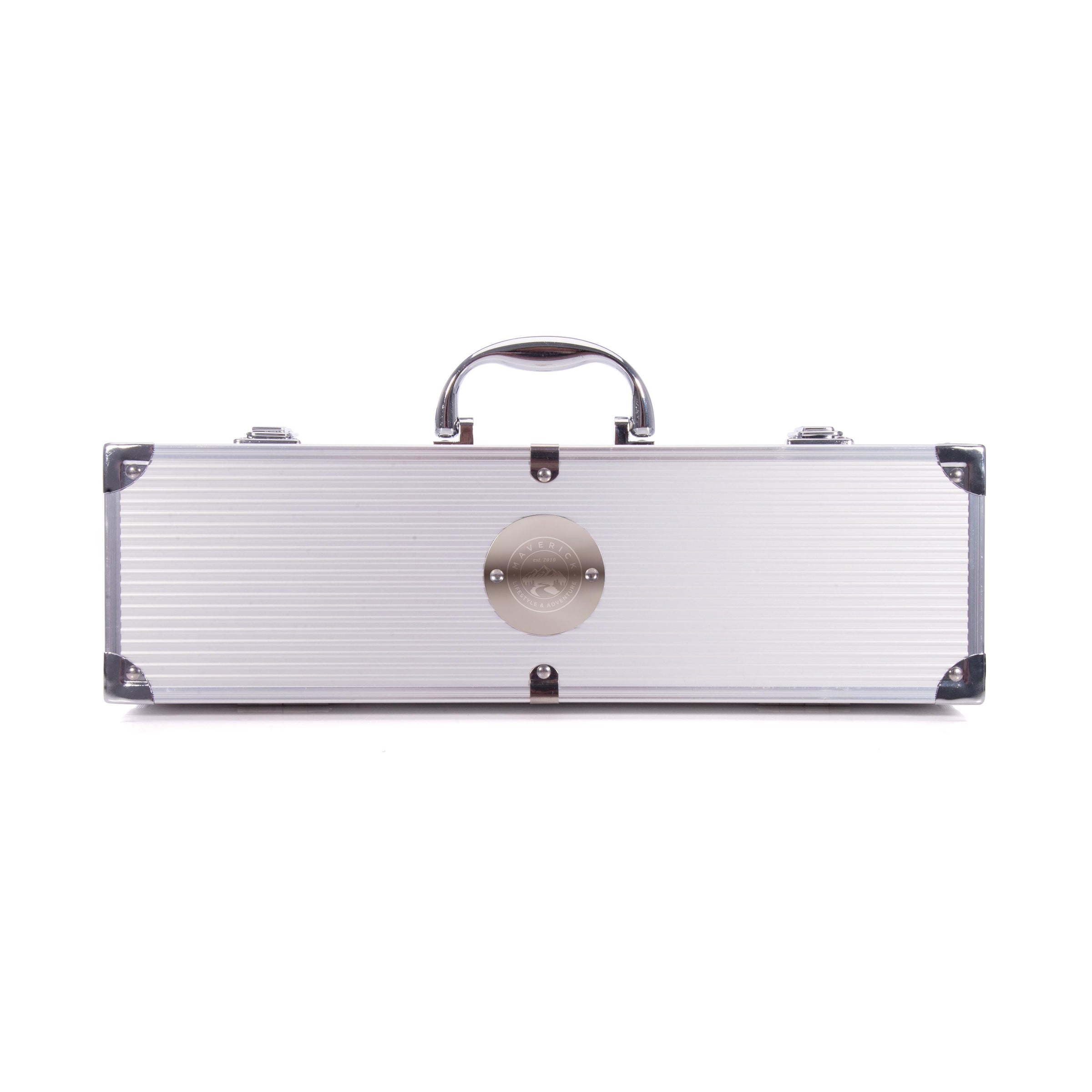 Lightweight aluminium case includes: Stainless Steel flat turner, meat fork, tongs and salt & pepper shakers.