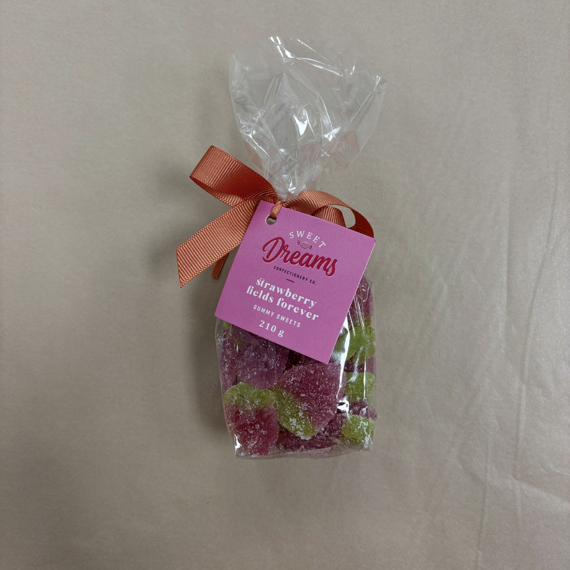 Indulge in the enchanting world of Sweet Dreams Confectionery Co., where every bite is a journey into a realm of sweetness and delight. This bag of sweets is full of fun gummy strawberries is tied with a ribbon and adorned with a pun-tastic name!