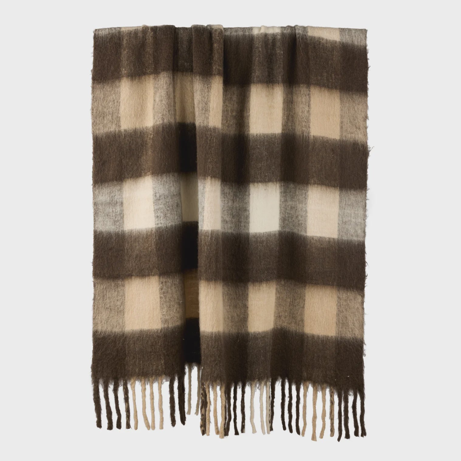 This Morgan Wool Blend Woven Throw is crafted from a soft touch wool, acrylic and polyester blend in a brown, taupe and white checkered pattern.