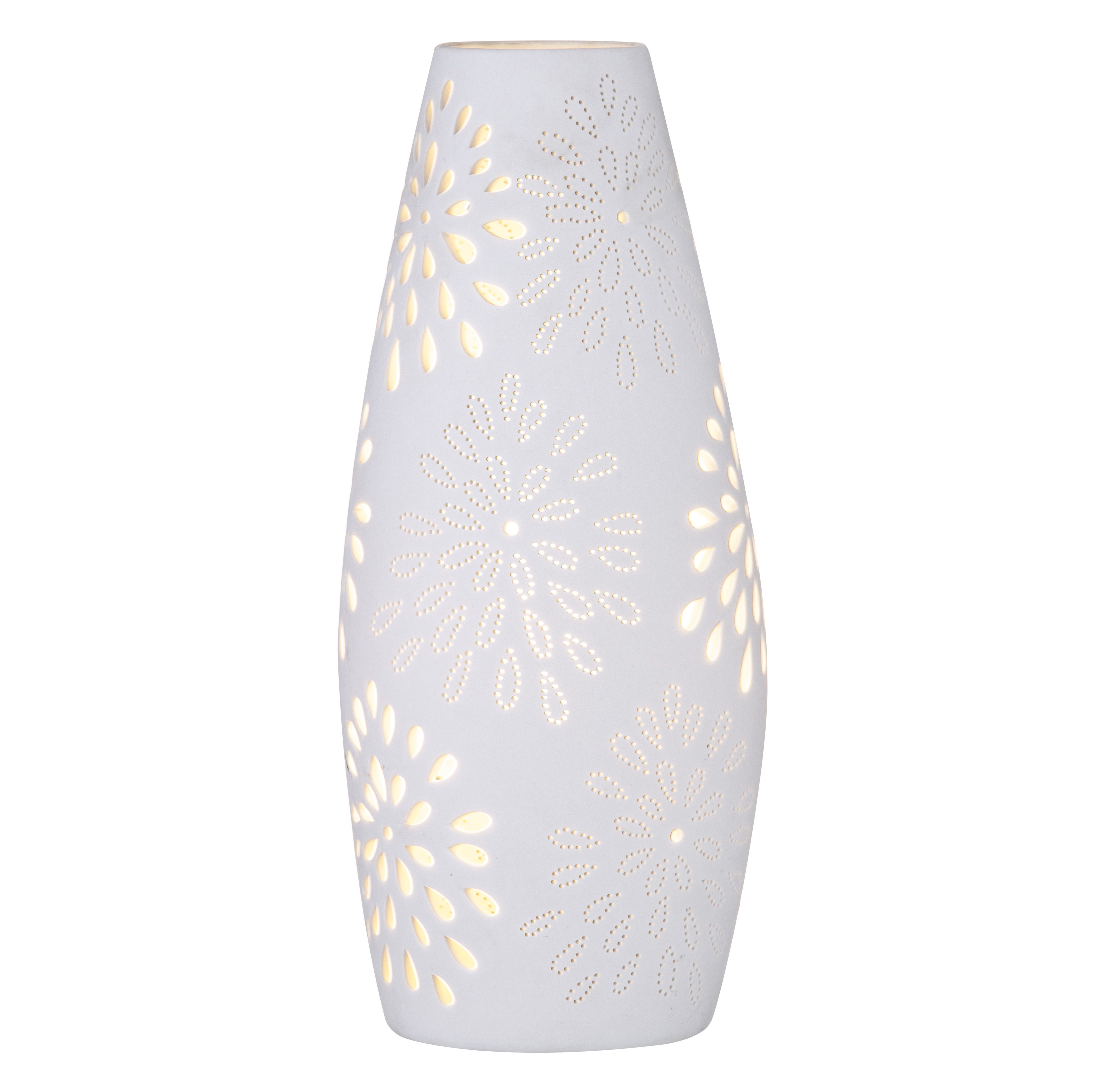 Made of fine white Porcelain with a hand carved pattern designed to send light cascading around your room.