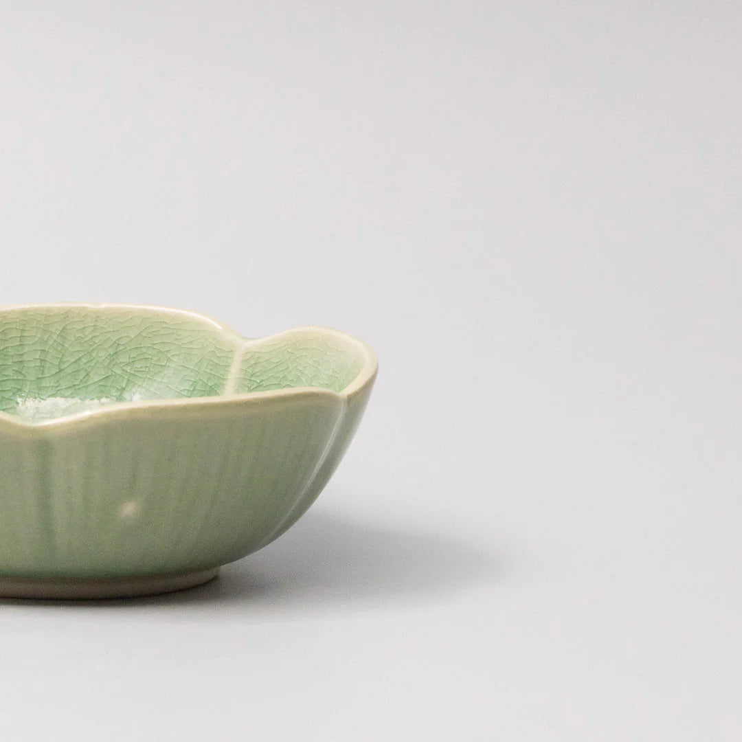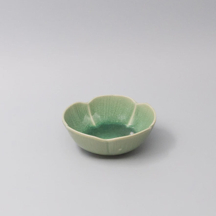 Featuring a delicate flower shaped sauce dish in a beautiful emerald glaze. Made of 'Minoyaki' porcelain, fired at a high temperature and hand finished.