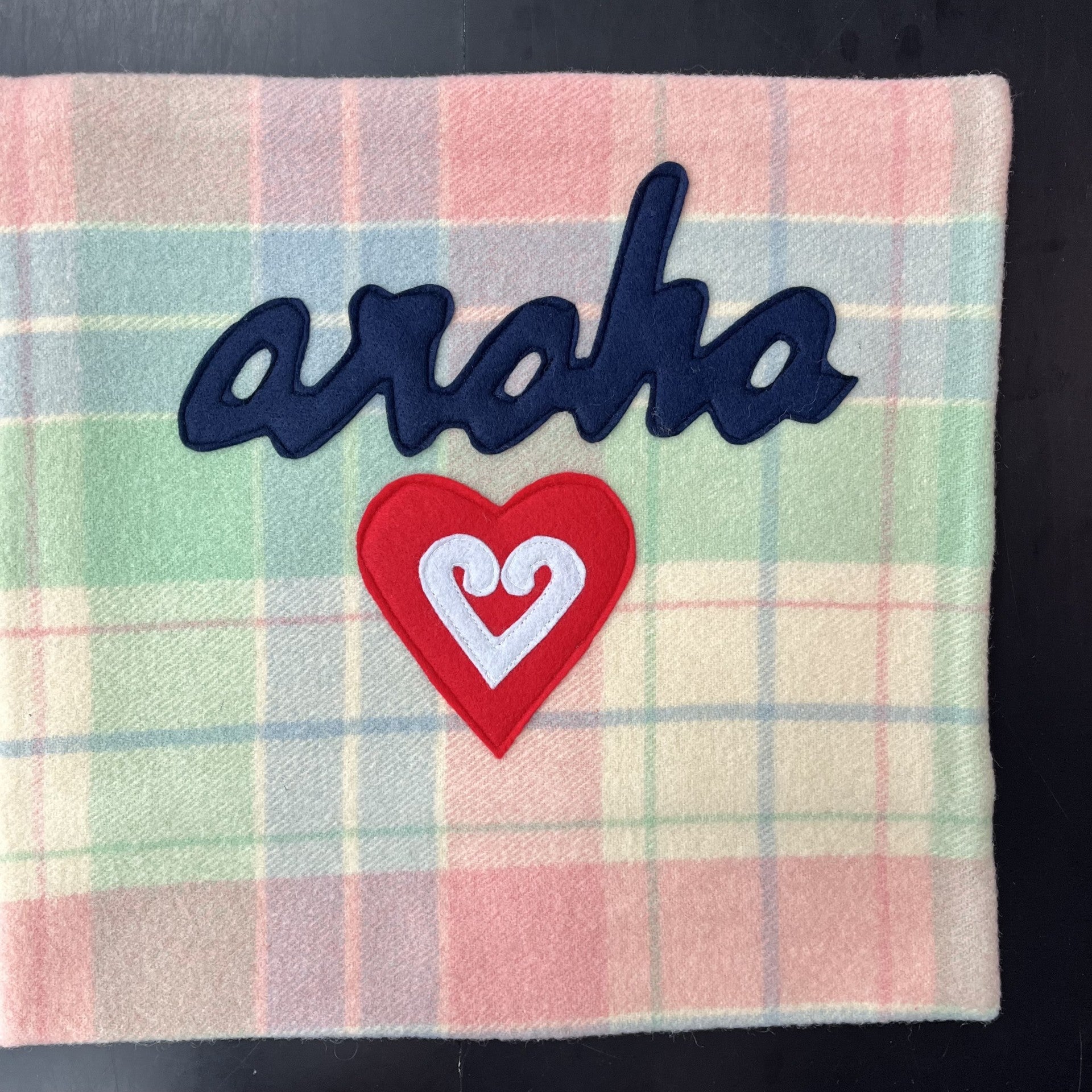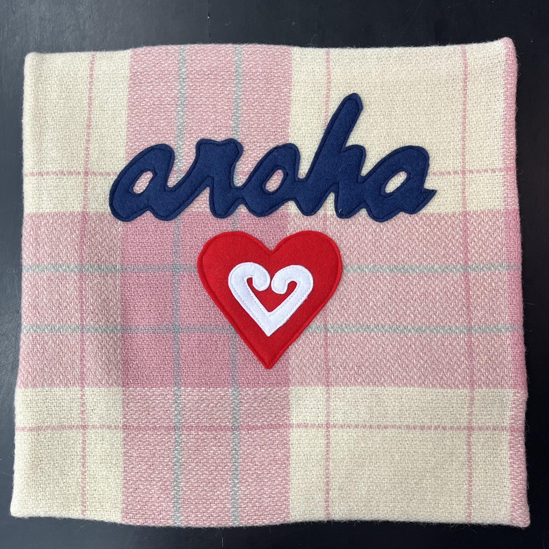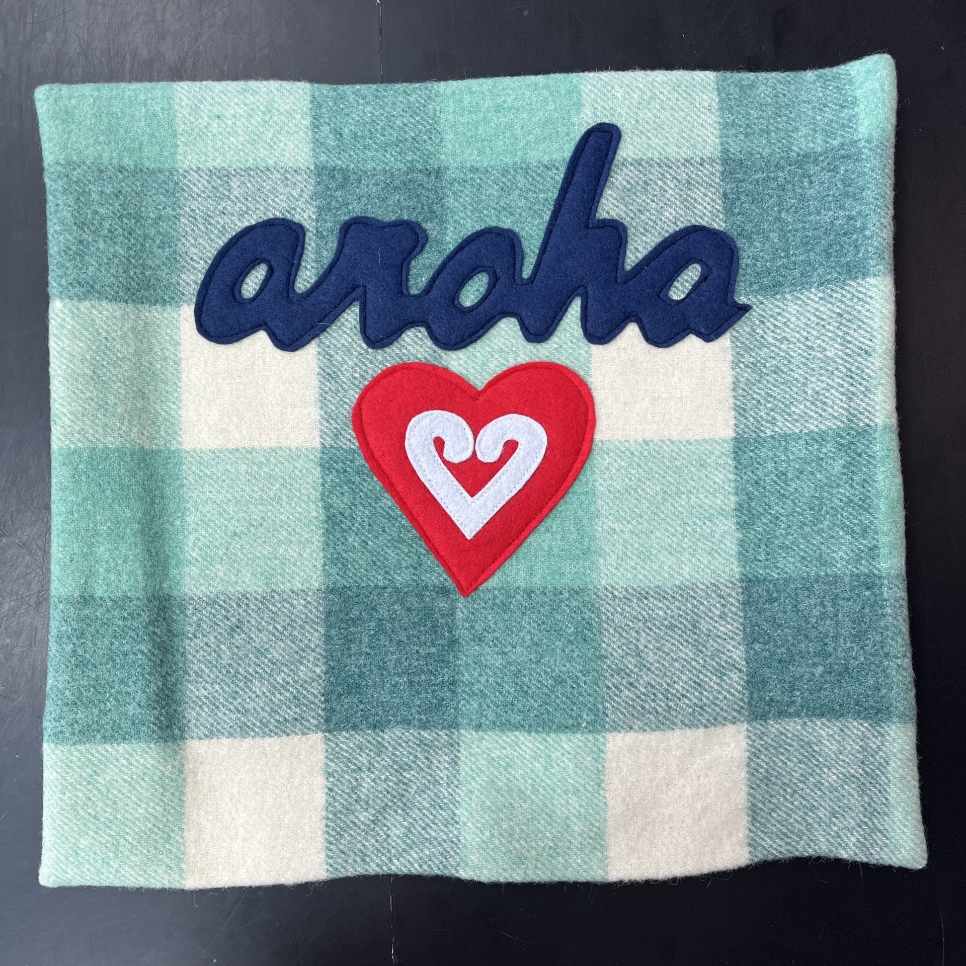 These handmade blanket cushions are lovingly made in New Zealand from recycled wool blankets and features a hand sewn motif.