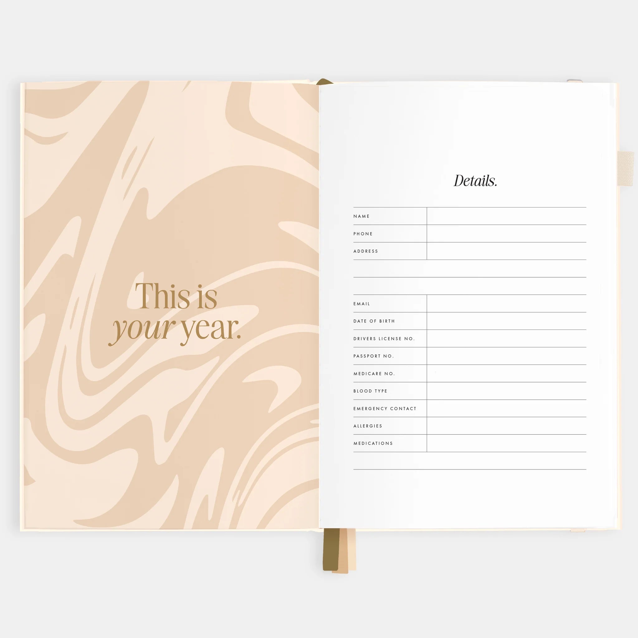 208 pages. One week per spread and monthly spreads at the beginning of each section. Gold foil stamped linen cover with gold foil edging. Three grosgrain ribbons in rust, blush and cream.