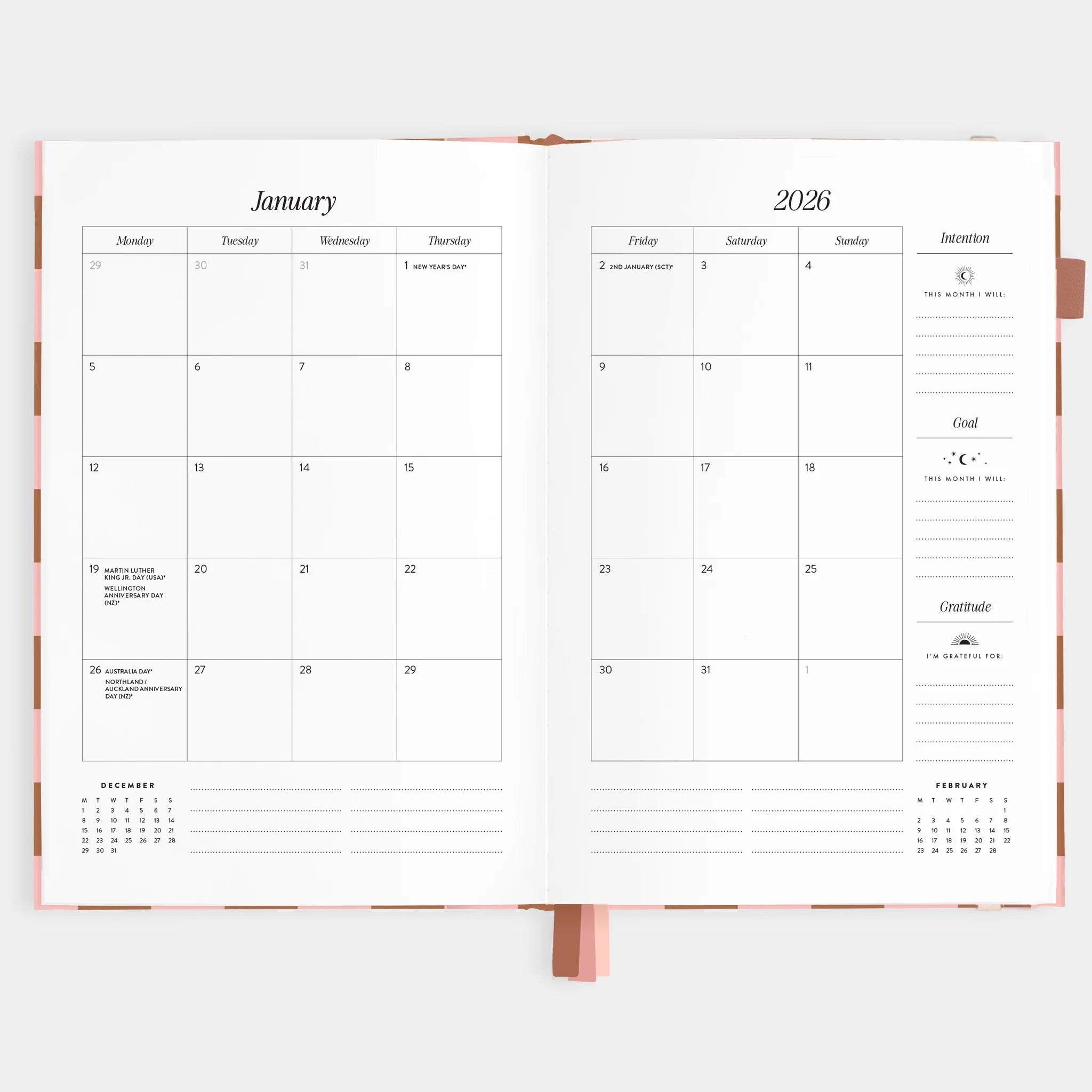 Each 2026 planner has been designed to be beautiful, functional and long-lasting, with patterned end pages, three ribbons and premium 120gsm FCS-certified paper. Holidays & observances for Australia, USA, Canada, UK & New Zealand. Packaged in a cello sleeve with gold foil bellyband.
