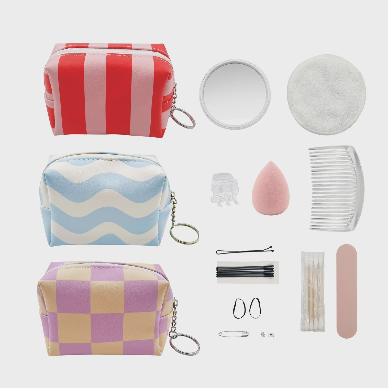 Never be caught in a fashion emergency again! This handy kit includes: hair accessories, nail file, earring back, safety pin, mirror and make up removal pad.
