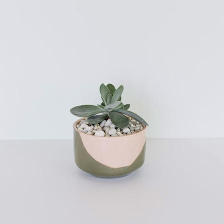 Planter with layered pink sand and sage green clays, glazed with transparent glaze. From the new 2018 collection