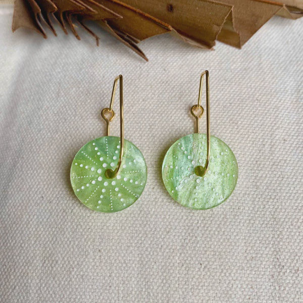 This kina inspired design looks stunning in a reflective, shimmery green. This beautiful disc design sits elegantly on a long gold hoop. The perfect earring to dress up an outfit or wear on a night out.