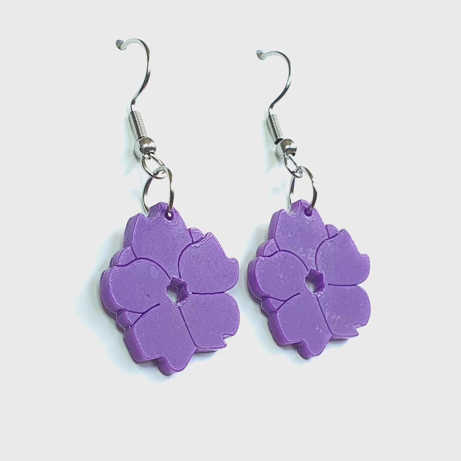 These Poroporo flower earrings are laser cut from sheets of 3D printer waste from Tūranga library.