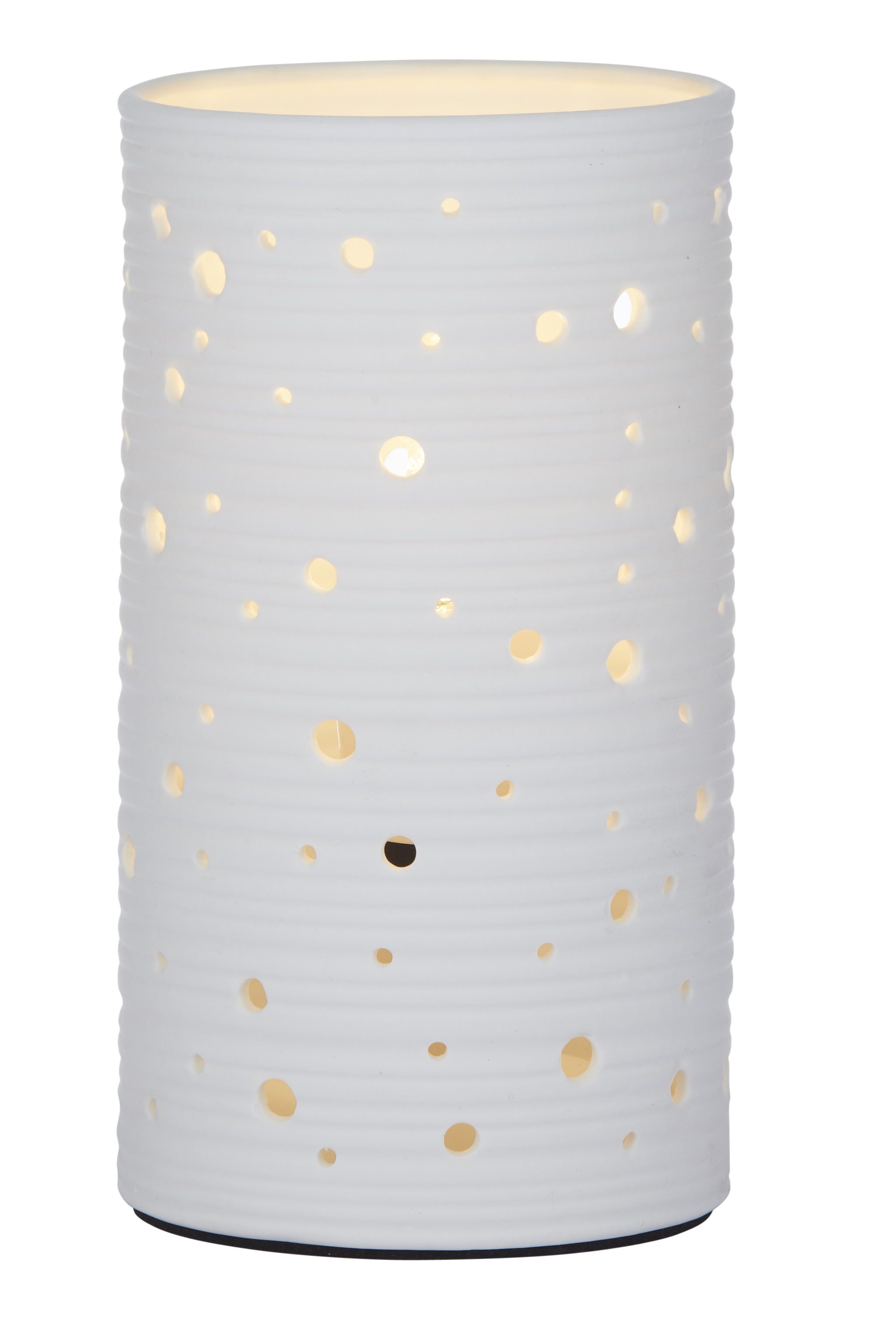 A white porcelain table lamp featuring a gorgeous detailed perforated pattern.