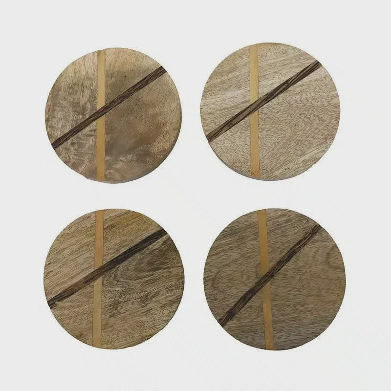 Elevate your living space with this set of four wood coasters featuring an elegant inlay design. Crafted to protect your surfaces while adding a touch of refined style, these coasters blend functionality with sophisticated craftsmanship, making them a perfect accessory for any modern home or office.